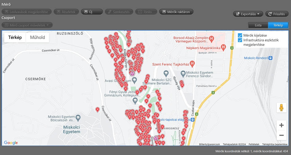 - mérők Google Maps alapú megjelenítése a könnyebb átláthatóság érdekében