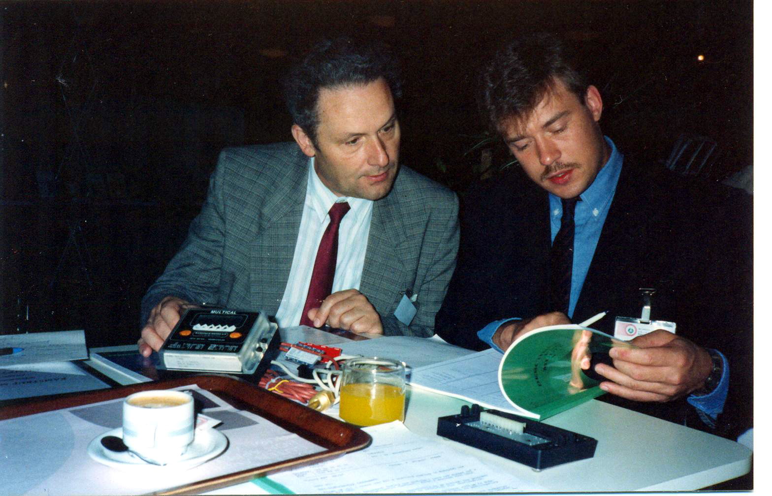 Csere László az OMH* akkori munkatársa a Mikael Hansennel a Multical® I (az első mikroprocesszoros Kamstrup hőfogyasztásmérő) dokumentációját tanulmányozza.